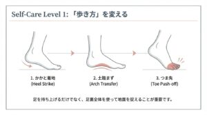 さらに、腕を振り、いつもより少し大股で歩くことを意識してください。これだけで足裏の筋肉が活性化されます。