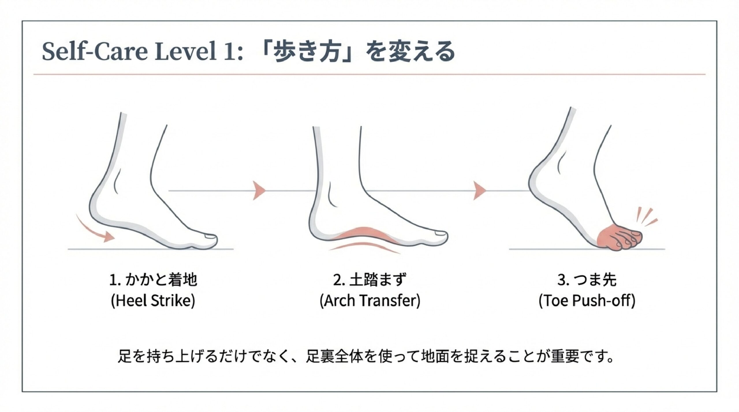 正しい「ローリング歩行」の順序は、かかと→土踏まず→つま先(親指の付け根)。