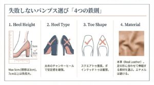 また、ピンヒールではなく、接地面の広い「太ヒール」や「ウェッジソール」を選んでください。