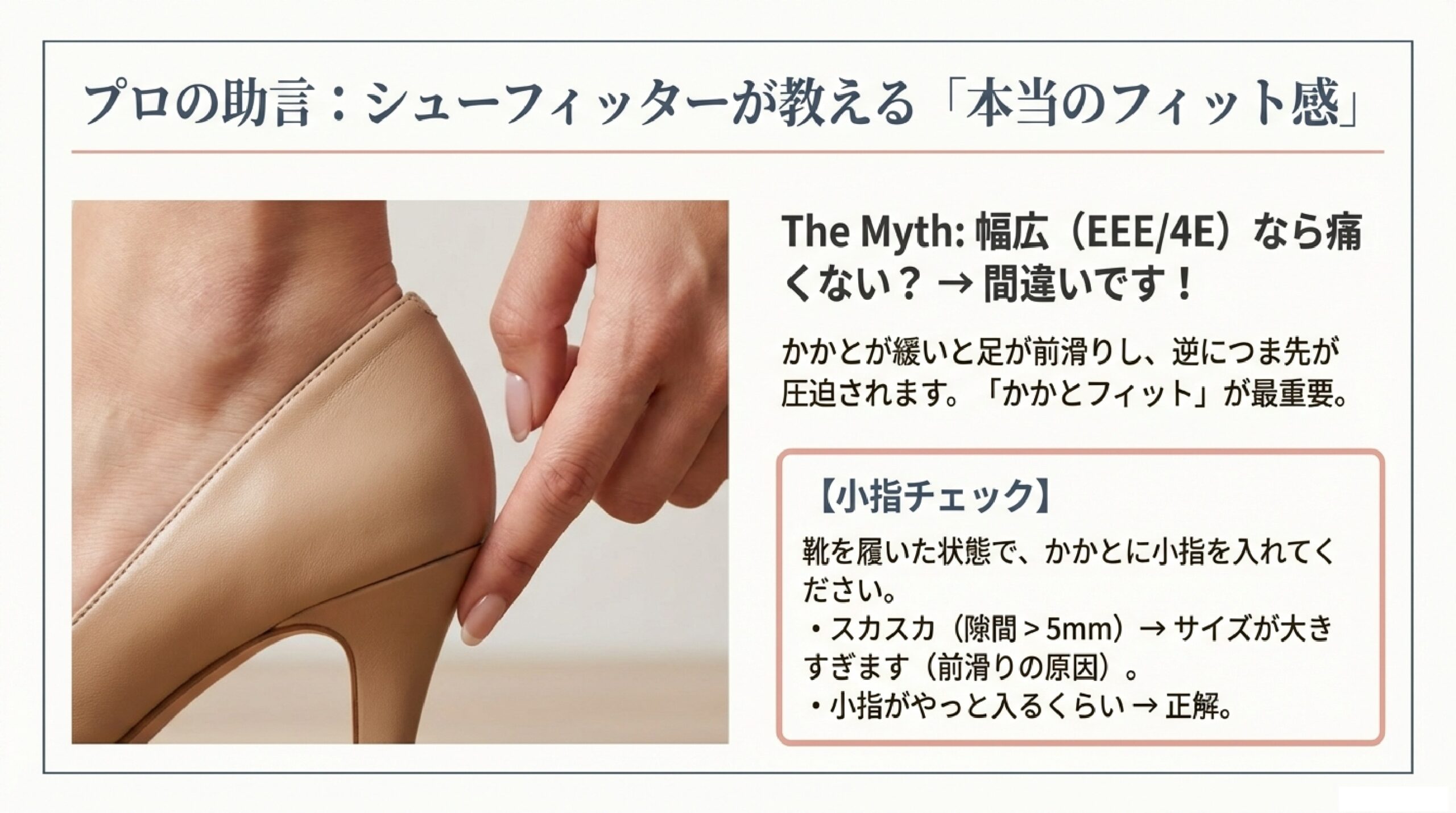 * ヒールカウンター(かかとの芯)の硬さを確認:ここがしっかりしていることで、足のグラつきを抑えられます。